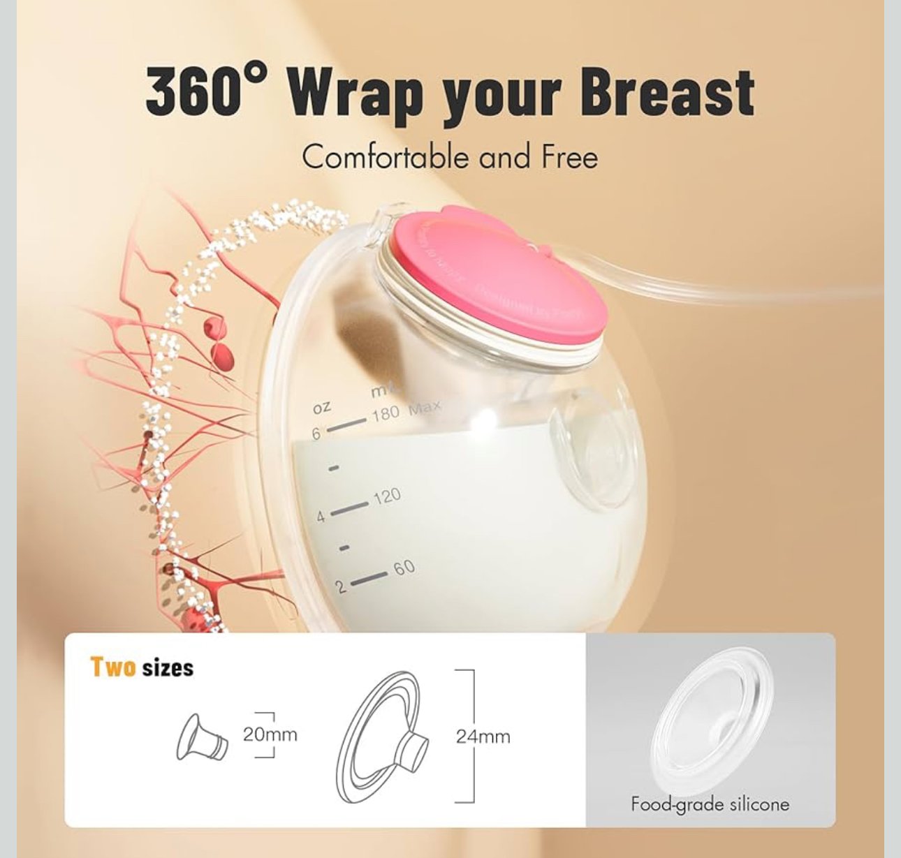 تأتي المجموعة مع قُمع مقاس 24 مم و إدخال سيليكون 20 مم لتناسب مقاسات مختلفة من الحلمات وتمنح إحساسًا لطيفًا ومريحًا أثناء الشفط.