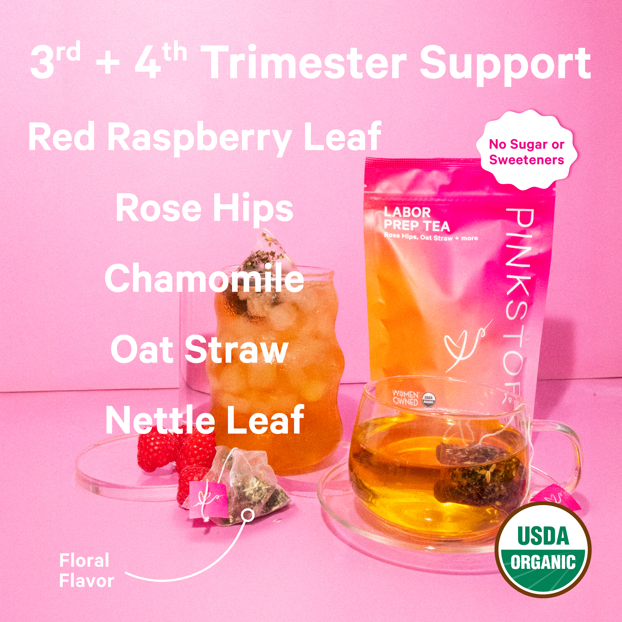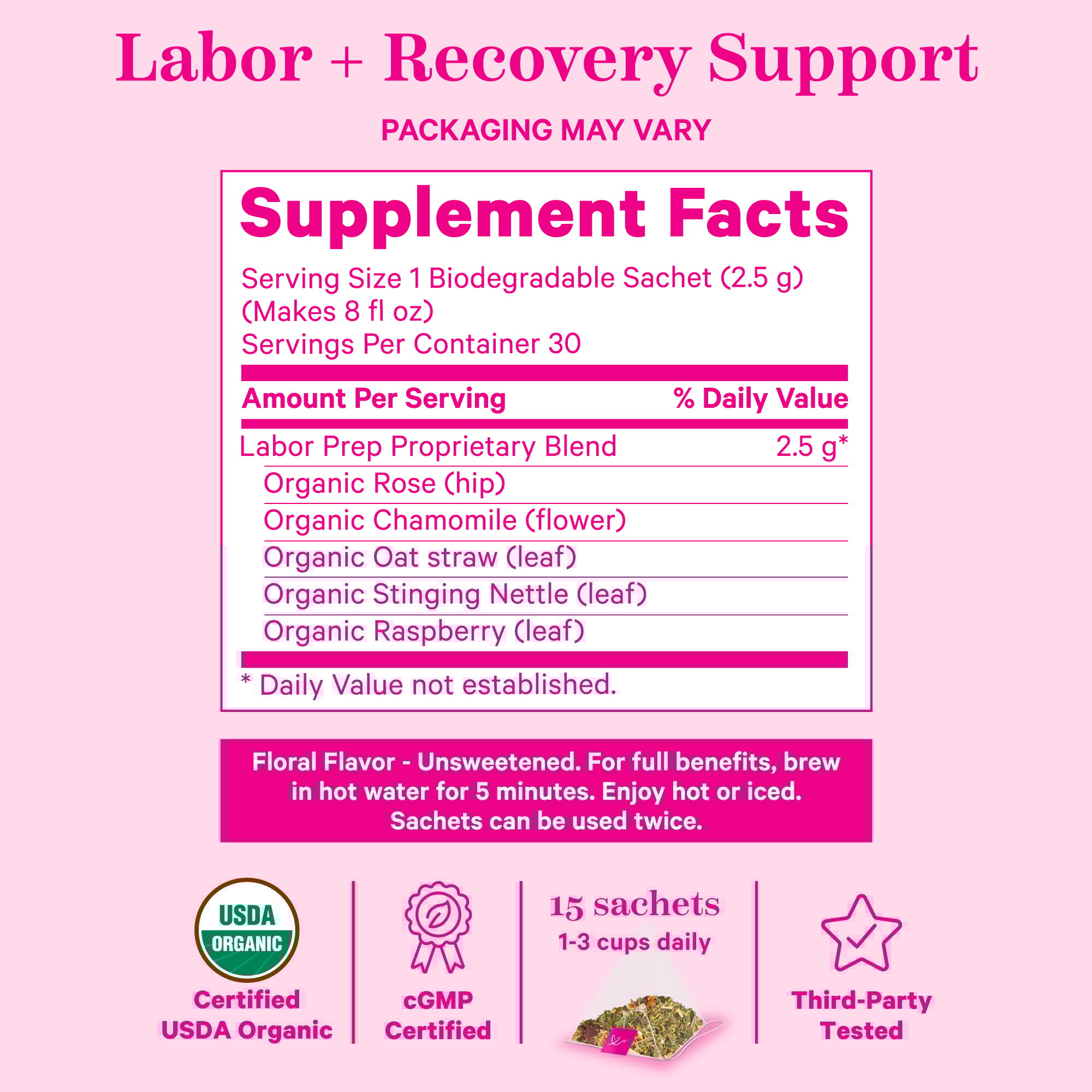 المكونات: ورد عضوي (هيب)البابونج العضوي (الزهور)قشور الشوفان العضوي (الأوراق)نبات القراص اللاذع العضوي (أوراق)، توت العليق العضوي (الأوراق)أوراق الستيفيا العضوية