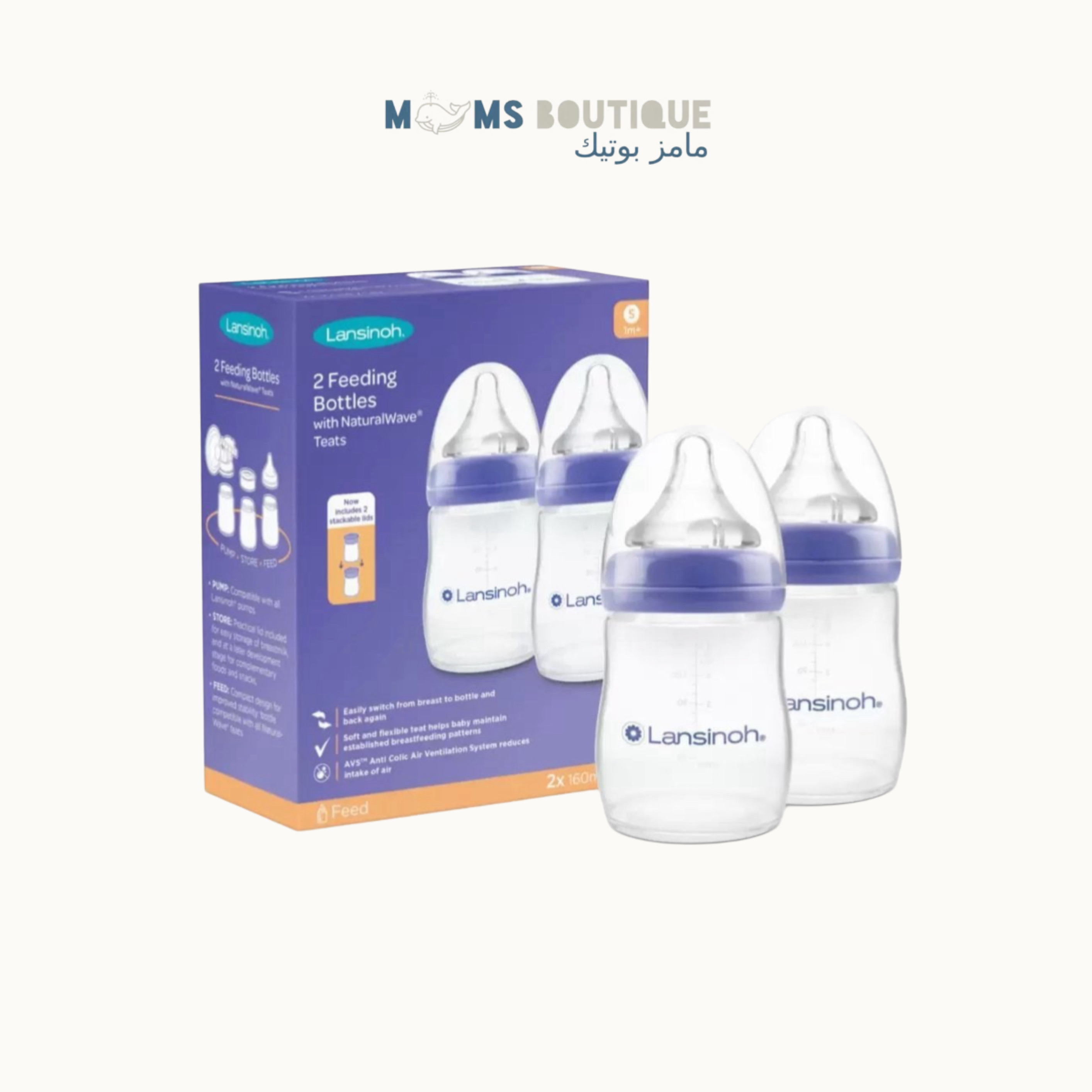 Lansinoh Natural Wave Starter Set Feeding Bottles and Teats هي مجموعة من الزجاجات المصممة للحد من خطر الارتباك بين الثدي والحلمة. يقلل نظام التهوية المضاد للمكود من امتصاص الهواء، وهو أحد أسباب المفص.