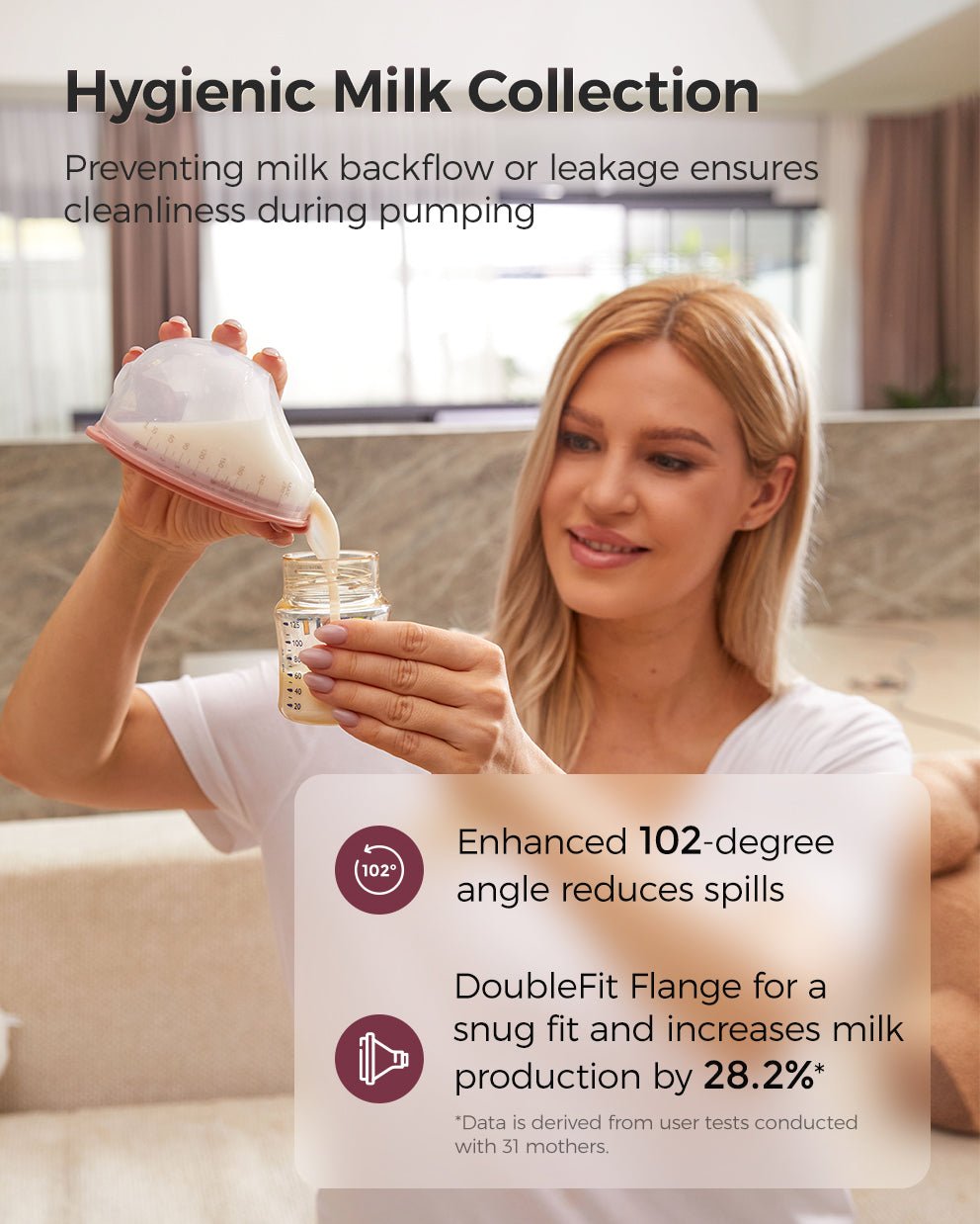 راحة دون فوضى – يأتي الكوب الجامع للحليب بتصميم مدمج فريد يمنع ارتجاع الحليب، مما يحافظ على نظافة وسلامة عملية الجمع. كما أن حافة DoubleFit المبتكرة بزاوية 102° تتيح للأم الانحناء براحة تامة أثناء جلسات الضخ.
