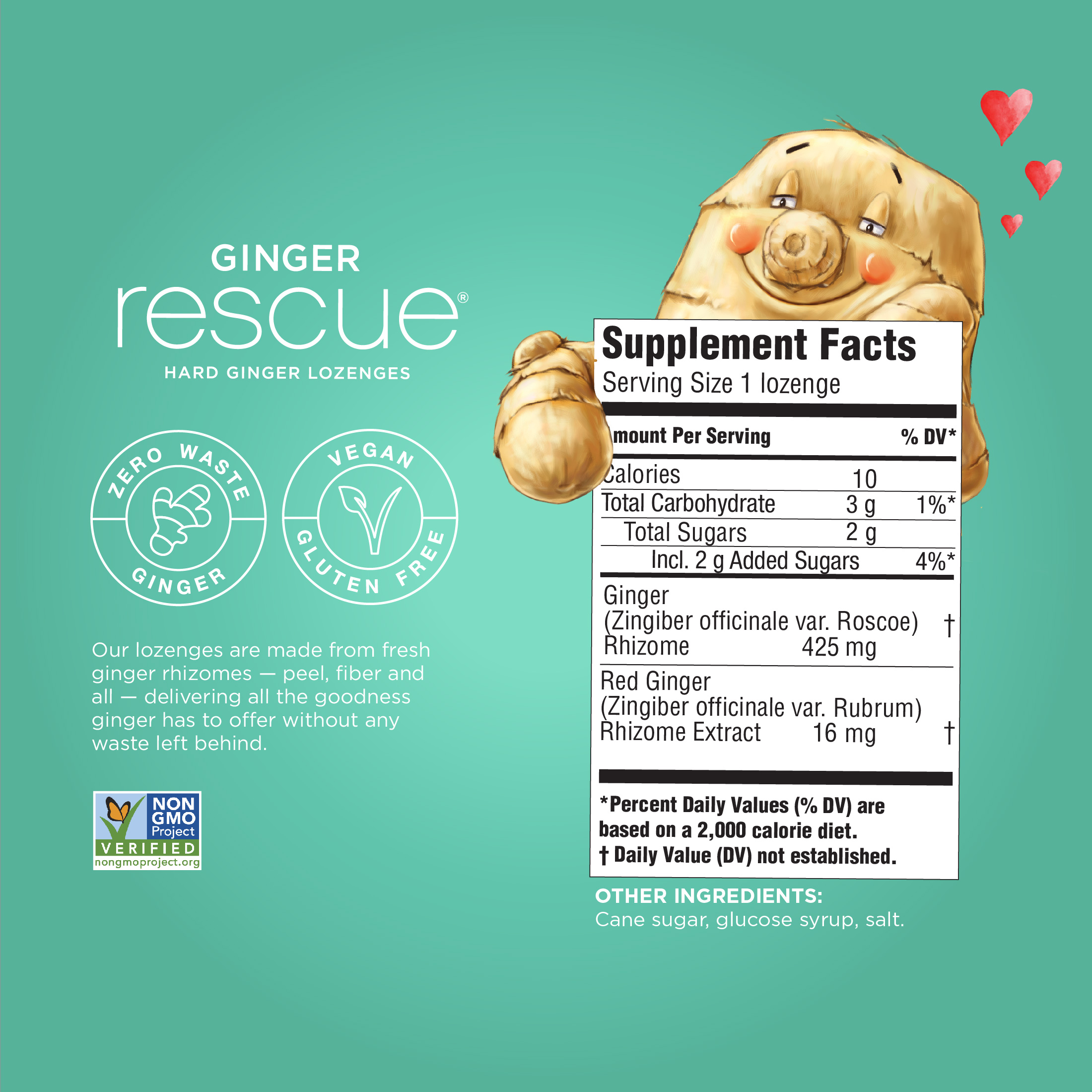 Experience the soothing, powerful relief of our drug-free, non-drowsy Ginger Rescue® Hard Ginger Lozenges from the World's #1 Ginger Brand! Designed for ultimate digestive comfort, these lozenges are safe and effective for adults and children. Aids in the relief of morning sickness, nausea, upset stomach, mild gas and indigestion, motion and sea sickness and bloating.* With 425mg of fresh ginger in every lozenge and boosted with real Red Ginger Extract for added efficacy, Ginger Rescue® Hard Ginger Lozenges offer consumers 20x the ginger of the leading brand with half the sugar (just 2g) -- a convenient, natural and drug-free approach to managing common digestive discomforts and travel-related stomach issues. Our Ginger Lozenges are caffeine-free and contain no dyes, artificial flavors or ingredients. Ginger has been used for thousands of years for its potent anti-nausea effects and is a travel essential for planes, road trips and cruises. Family-owned for nearly 40 years, The Ginger People® are known for their GIN GINS® functional ginger candy and ginger chews. We work with small-scale farmers who share a reverence for the land through sustainable farming practices.